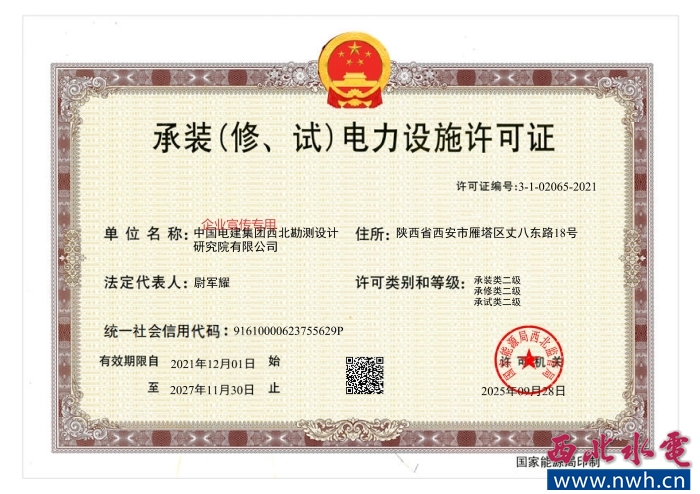 近日,国家能源局西北监管局核发公司电力承装(修、试)二级许可证,标志着公司在电力设施安装、维修及试验领域的能力获得国家能源监管部门的权威认可。根据《承装(修、试)电力设施许可证管理办法》,该二级资质准予公司开展330千伏及以下电压等级电力设施的安装、维修及试验业务,是公司拓展新能源业务的法定依据,大大提高了公司的核心竞争力,为公司更好的参与新能源产业竞争奠定了基础。 本项工作在公司多部门协同配合下,高标准完成了申报材料的整编和提审工作。所申报的承装类、承修类、承试类资质均符合国家各项标准、规定,顺利通过资质评审。目前公司已持有“四综一甲”:工程勘察、工程设计、工程监理、工程咨询四项综合资质资信和城乡规划编制甲级资质(已通过延续)以及水利水电工程、电力工程、市政公用工程、建筑工程4项施工总承包一级,机电工程、公路工程2项施工总承包二级,电子与智能化工程一级、环保工程一级、河湖整治工程二级3项施工专业承包资质。同时,公司还拥有支持多业务发展的地灾、水资源、水土保持、特种设备、造价、勘察、设计、咨询AAA、试验检测等一系列行政许可及信用评价的资质体系。全面的资质资信为公司拓展市场创造了良好条件,为公司高质量发展奠定了坚实基础。 因报审资料和审批延续性的要求,目前证书地址仍为原公司地址,公司将尽快跟进地址变更及证后核查工作。 |